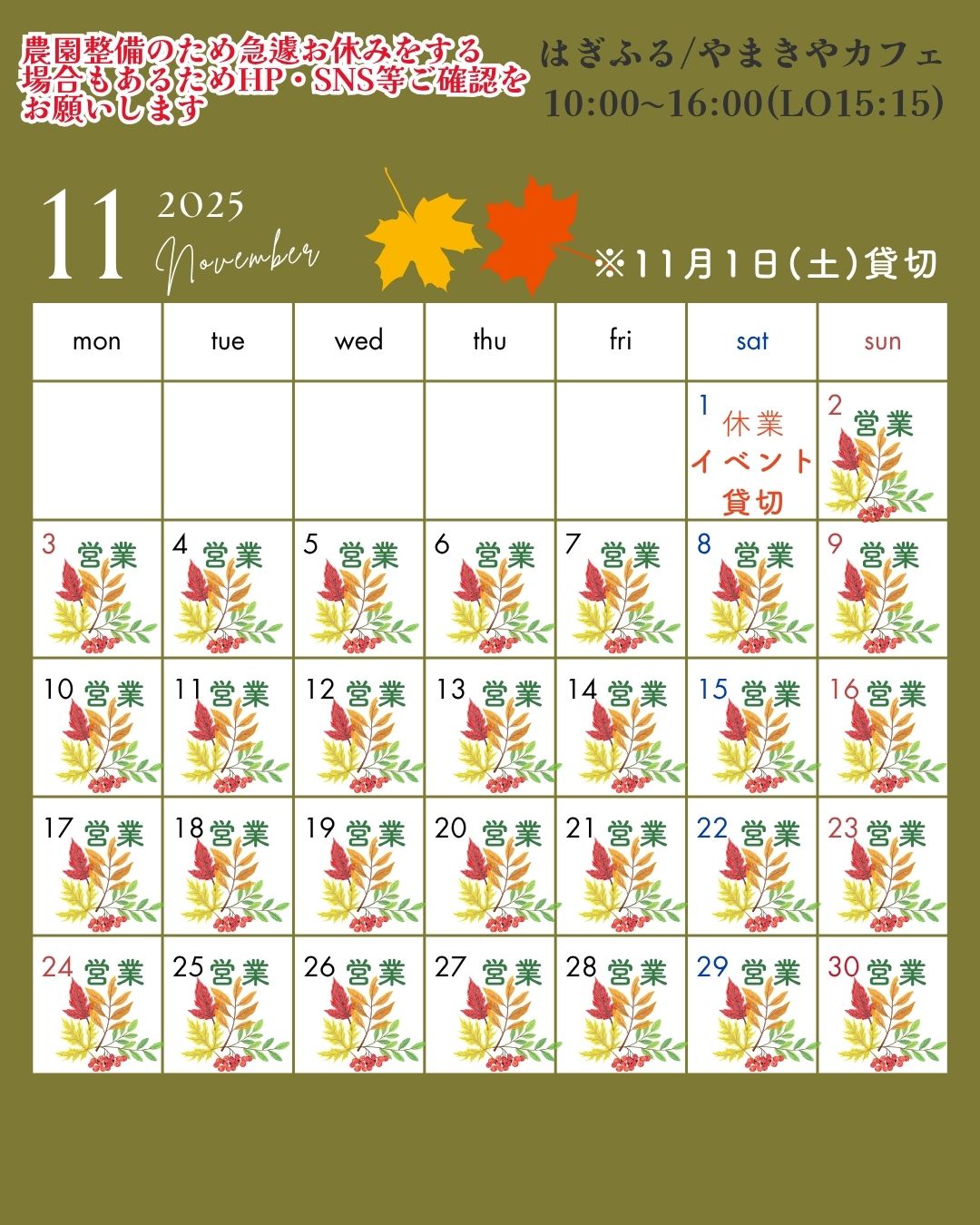 10月~ 10:00~16:00 (L.O. 15:15)