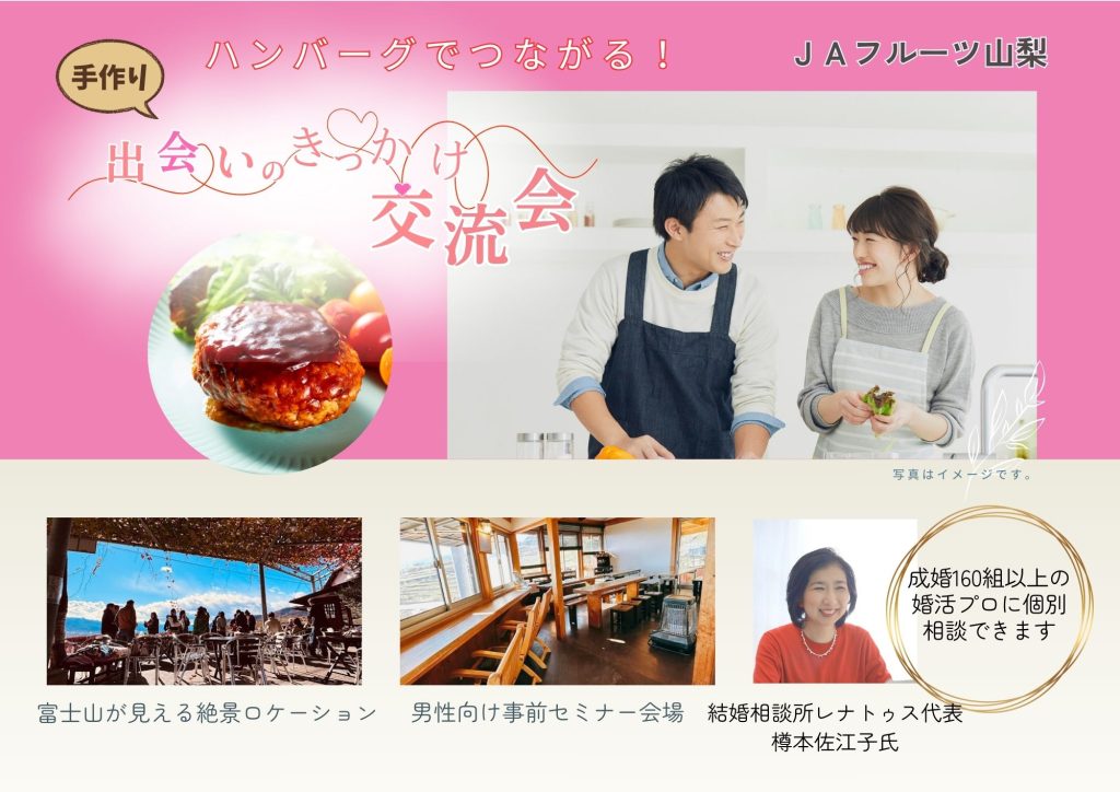 今回のイベントでは、JAフルーツ山梨様との共同開催で実施します。参加者みんなでハンバーグ作りにチャレンジ!材料を切ったり、こねたり、焼き加減を相談したり…自然と会話が生まれる“おいしい出会い”の時間です。料理が得意な人も、ちょっと苦手な人も大歓迎。協力しながら作ったハンバーグの味は、きっと格別!一緒に笑って、一緒に味わって、新しいご縁を育んでみませんか?
